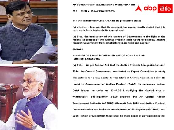 అమరావతి రాజధాని విభజన చట్టం ప్రకారం ఏర్పడిందని స్పష్టం చేస్తూ.. లోక్ సభలో కేంద్ర మంత్రి నిత్యానందరాయ్ విజయసాయిరెడ్డికి సమాధానం ఇచ్చారు. ఏపీ పునర్విభజన చట్టంలోని ఐదు, ఆరు సెక్షన్ల కింద నిపుణుల కమిటీని ప్రభుత్వం నియమించిందని.. ఆ కమిటీ రిపోర్టును కేంద్రం.. ఏపీ ప్రభుత్వానికి పంపిందన్నారు. తర్వాత ఏపీ ప్రభుత్వం రాజధానిగా అమరావతిని ఖరారు చేసిందని.. 2015లోనే నోటిపై చేసిందని నిత్యానందరాయ్ తన సమాధానంలో స్పష్టం చేశారు. ఆ తర్వాత మళ్లీ 2020లో ఏపీ ప్రభుత్వం మూడు రాజధానుల కోసం బిల్లులు తెచ్చిందని తెలిపారు.