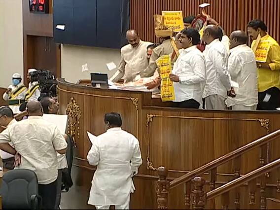 అసెంబ్లీలో ఆందోళనల నేపథ్యంలో వాయిదా పడి మళ్లీ అసెంబ్లీ ప్రారంభంకాగానే టీడీపీ సభ్యులను స్పీకర్ తమ్మినేని సస్పెండ్ చేశారు. అచ్చెన్నాయుడు, డోలా బాలవీరాంజనేయులు, సహా మొత్తం 11 మంది సభ్యులను సస్పెండ్ చేస్తున్నట్లుగా స్పీకర్ ప్రకటించారు. వారంతా గౌరవప్రదంగా బయటకు వెళ్లిపోవాలని స్పీకర్ ఆదేశించారు.