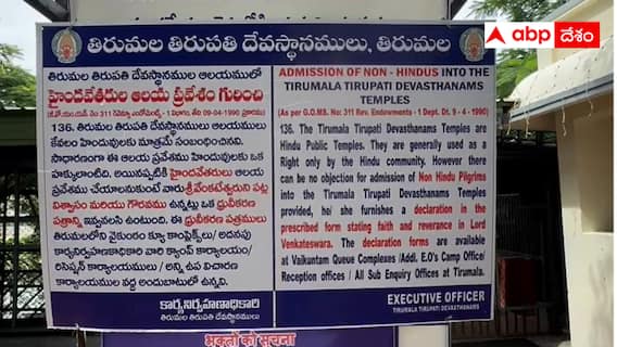 Tirumala : జగన్మోహన్ రెడ్డి తిరుమల పర్యటన సమయంలో తిరుపతిలో అన్యమతస్తుల డిక్లరేషన్ అంశంపై విధివిధానాలు వివరిస్తూ బోర్డులు ఏర్పాటయ్యాయి. తిరుపతిలో టీటీడీకి చెందిన భవనాలు ఉన్న చోటల్లా ఈ బోర్డులు ప్రత్యక్షమయ్యాయి. అందులో అన్యమతస్తుల దర్శన సంప్రదాయాల గురించి వివరించారు. డిక్లరేషన్లు అధికారుల వద్ద అందుబాటులో ఉంటాయని.. స్వామివారిపై తమకు విశ్వాసం ఉందని చెప్పి డిక్లరేషన్ ఫాంపై సంతకం చేయాల్సి ఉంటుందని అందులో పేర్కొన్నారు. తిరుపతితో పాటు తిరుమలలో కూడా ఈ బోర్డులు ఏర్పాటు చేశారు.