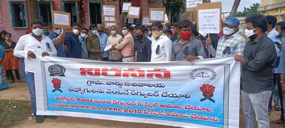 రూ.15వేల జీతంతో నెట్టుకురాలేం..నెల్లూరు జిల్లా వ్యాప్తంగా సచివాలయ ఉద్యోగులు రోడ్డెక్కారు. విధులను బహిష్కరించి ఎంపీడీవో ఆఫీస్ ల వద్ద ఆందోళన చేపట్టారు. తమకు న్యాయం చేయాలని, ప్రొబేషన్ వెంటనే డిక్లేర్ చేయాలని డిమాండ్ చేశారు. 15వేల నెలజీతంతో జీవనం ఇబ్బందిగా మారిందని చెప్పారు. ప్రజలకు ఇబ్బంది కలిగించే ఉద్దేశం తమకు లేదని, కానీ తమ హక్కులకోసం ఇలా రోడ్డెక్కాల్సి వచ్చిందని చెప్పారు. ప్రభుత్వం సానుకూల దృక్పథంతో తమ సమస్యలు పరిష్కరించాలని ప్రొబేషన్ డిక్లేర్ చేసి, జీతాలు పెంచాలని కోరారు. కోవూరు మండలంలోని సచివాలయ ఉద్యోగులు నల్ల బ్యాడ్జీలు ధరించి ఎంపీడీవో కార్యాలయానికి ప్రదర్శనగా తరలి వచ్చారు. ఉన్నతాధికారులకు వినతిపత్రాలు అందించారు.