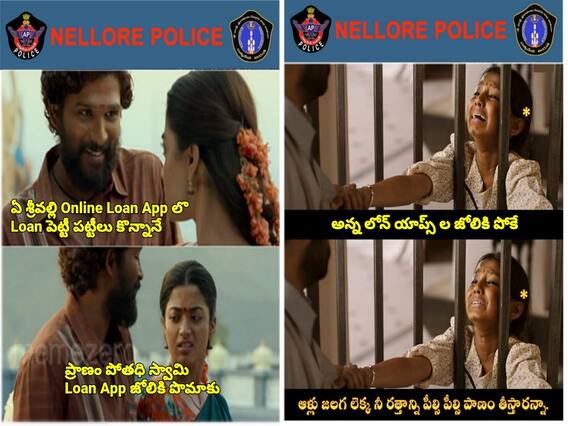 పుష్ప, ఆర్ఆర్ఆర్, రఘువరన్ బీటెక్ సినిమాల్లో కొన్ని సన్నివేశాలను తీసుకుని, వాటిలో నటీనటులు మాట్లాడుకుంటున్నట్టుగా మీమ్స్ తయారు చేసి ట్విట్టర్లో పెట్టారు నెల్లూరు పోలీసులు. ఇప్పుడీ మీమ్స్ వైరల్ గా మారాయి. అందర్నీ ఆకట్టుకుంటున్నాయి. ఆలోచనలో పడేశాయి. ఆన్ లైన్ లో అప్పు తీసుకుంటే, తిరిగి చెల్లించాల్సిన సొమ్ము రెట్టింపవడంతోపాటు, వేధింపులు కూడా ఉంటాయనేది ఈమీమ్స్ సారాంశం.