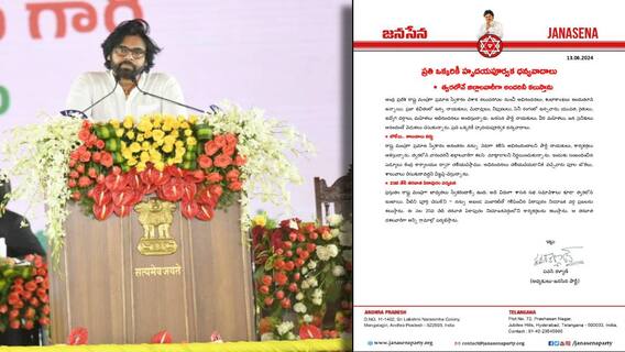 ధన్యవాదాలు తెలుపుతూ లేఖతనను పిఠాపురం నియోజకవర్గం నుంచి 70వేల భారీ మెజార్టీతో గెలిపించిన ప్రజలకు, గెలిచిన తర్వాత.. అలాగే మంత్రిగా ప్రమాణ స్వీకారం చేసిన తర్వాత అభినందనలు చెబుతున్న వారికి జనసేన అధినేత పవన్ కళ్యాణ్ హృదయపూర్వక ధన్యవాదాలు తెలుపుతూ ఓ లేఖను విడుదల చేశారు. ‘‘ప్రజా జీవితంలో ఉన్న మేధావులు, నాయకులు, నిపుణులు, సినీరంగం ప్రముఖులు, యువత, రైతులు ఇలా అందరూ నాకు అభినందనలు చెబుతున్నారు. ప్రతి ఒక్కరికీ నా హృదయపూర్వక ధన్యవాదాలు. త్వరలోనే జిల్లాల వారీగా పర్యటించి అందరినీ కలిసి మాట్లాడాలని నిర్ణయించుకున్నాను. దయచేసి నాకు అభినందనలు తెలియజేయడానికి వచ్చే వారు పూల బొకేలు, శాలువాలు తీసుకురావద్దని విజ్ఞప్తి చేస్తున్నా’’అని పవన్ కళ్యాణ్ లేఖలో పేర్కొన్నారు.