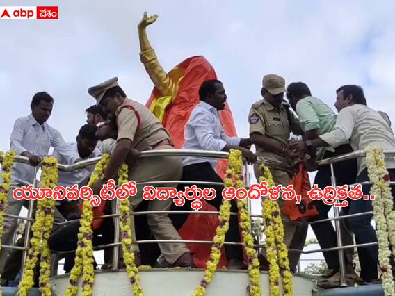 YSR Statue at Sri Krishnadevaraya University: అనంతపురం: చదువు చెప్పాల్సిన చోట రాజకీయ నేతల విగ్రహాలు పెట్టి రాజకీయాలు చేస్తున్నారంటు శ్రీకృష్ణదేవరాయ యూనివర్సిటీ (Sri Krishnadevaraya University)లో పలు స్టూడెంట్ సంఘాలు ఆందోళన చేపట్టాయి. శ్రీకృష్ణదేవరాయ యూనివర్సిటీలో ఉమ్మడి ఏపీ మాజీ సీఎం వైఎస్ రాజశేఖరరెడ్డి విగ్రహ ఆవిష్కరణ చేశారు. అయితే వర్సిటీలో వైఎస్సార్ విగ్రహం ఎలా చేస్తారంటూ విద్యార్థి సంఘం నేతలు తీవ్రంగా వ్యతిరేకిస్తూ అడ్డుకునే ప్రయత్నం చేశారు. దీంతో యూనివర్సిటీలో కాసేపు తీవ్ర ఉద్రిక్తత నెలకొంది. పోలీసులకు విద్యార్థి సంఘం నేతలకు తీవ్ర వాగ్వాదం చోటుచేసుకుంది. యూనివర్సిటీ ఒక రాజకీయ పార్టీకి సొంతం కాదని చదువు చెప్పే విద్యాలయంలో అందరూ సమానమేనని విద్యార్థి సంఘం నేతలు నినాదాలు చేశారు. ఏర్పాటు చేసిన మాజీ ముఖ్యమంత్రి వైయస్ రాజశేఖర్ రెడ్డి విగ్రహాన్ని వెంటనే తొలగించాలని వారు డిమాండ్ చేశారు. ఈ కార్యక్రమంలో విద్యార్థి సంఘం నేతలు పోలీసుల మధ్య తీవ్ర తోపులాట జరిగింది. కొందరు విద్యార్థి సంఘం నేతలను పోలీసులు అదుపులోకి తీసుకున్నారు.
