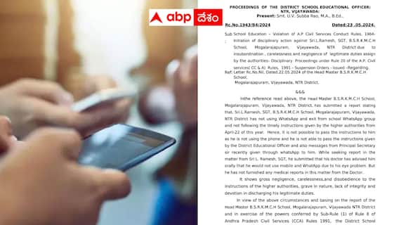 విజయవాడలోని మొగల్రాజపురంలో బీఎస్ఆర్కే మున్సిపల్ హైస్కూల్లో పని చేస్తున్న ఎల్ రమేష్ అనే ఉపాధ్యాయుడ్ని సస్పెండ్ చేస్తూ జిల్లా విద్యాశాఖాధికారి ఉత్తర్వులు జారీ చేశారు. ఇందులో విద్యాశాఖాధికారి చెప్పినప్రధాన కారణం... సదరు ఉపాధ్యాయుడు ఎల్ రమేష్ వాట్సాప్ చూడటం లేదట. అంతే కాదు స్కూల్ గ్రూప్ నుంచి ఎగ్జిట్ అయ్యారట. స్కూల్ గ్రూపు నుంచి ఎగ్జిట్ అయి.. వాట్సాప్ చూడకపోవడం వల్ల...ఉన్నతాధికారులు ఇచ్చే ఆదేశాలను ఆయన మిస్ అవుతున్నారని అంటున్నారు. ఆయనతో కమ్యూనికేట్ చేయడం కష్టంగా ఉందని..చెబుతున్నారు.