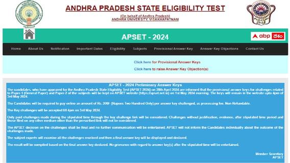 AP SET Answer Key: ఆంధ్రప్రదేశ్లోని యూనివర్సిటీల్లో అసిస్టెంట్ ప్రొఫెసర్లు, డిగ్రీ కళాశాలల లెక్చరర్ పోస్టులకు అర్హత సాధించేందుకు నిర్వహించిన ఏపీసెట్(APSET)-2024 పేపర్-1, పేపర్-2 పరీక్షల ప్రాథమిక ఆన్సర్ కీని ఆంధ్రా యూనివర్సిటీ మే 1న విడుదల చేసింది. అధికారిక వెబ్సైట్లో సబ్జెక్టులవారీగా ఆన్సర్ కీని అందుబాటులో ఉంచింది. పరీక్ష రాసిన అభ్యర్థులు అధికారిక వెబ్సైట్ నుంచి సబ్జెక్టుల వారీగా ప్రిలిమినరీ కీ షీట్ని డౌన్లోడ్ చేసుకోవచ్చు. ఆన్సర్ కీపై ఏమైనా అభ్యంతరాలుంటే తెలిపేందుకు అవకాశం కల్పించింది. అభ్యర్థులు మే 3న సాయంత్రం 4 గంటల్లోగా అభ్యంతరాలు తెలియజేయవచ్చు. అయితే అభ్యంతరాలు తెలిపే ఒక్కో ప్రశ్నకు రూ.200 ఫీజుగా చెల్లించాల్సి ఉంటుంది. నిర్ణీత ఫీజు చెల్లించి, గడువులోగా వచ్చిన అభ్యంతరాలను మాత్రమే పరిగణనలోకి తీసుకుంటారు. అభ్యర్థులు తెలిపిన అభ్యంతరాలను నిపుణుల పరిశీలన తర్వాత ఫైనల్ ఆన్సర్ కీని అధికారులు విడుదల చేయనున్నారు.