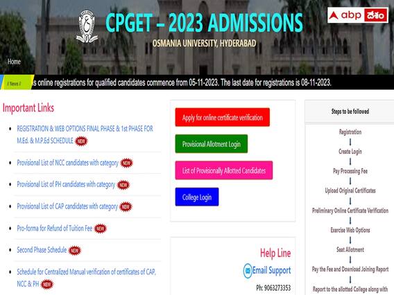➥ సీపీగెట్-2023 అర్హత సాధించిన అభ్యర్థుల ఆన్లైన్ సర్టిఫికేట్ వెరిఫికేషన్ కోసం రిజిస్ట్రేషన్ (ఎంఈడీ, ఎంపీఈడీతో కలిపి): 05.11.2023 - 08.11.2023.