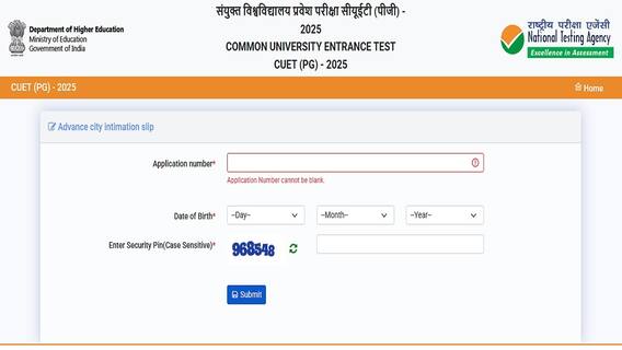 సిటీ ఇంటిమేషన్ స్లిప్ ఇలా డౌన్లోడ్ చేసుకోండి.. ➥సీయూఈటీ పీజీ 2025 సిటీ ఇంటిమేషన్ స్లిప్ పొందడానికి అభ్యర్థులు మొదట అధికారిక వెబ్సైట్లోకి వెళ్లాలి. - https://cuetpg.ntaonline.in/ ➥ అక్కడ హోమ్పేజ్లో కనిపించే "CUET PG 2025 City Intimation Slip" లింక్పై క్లిక్ చేయాలి. ➥ విద్యార్థులు తమ అప్లికేషన్ నెంబరు, పుట్టినతేదీ వివరాలు, సెక్యూరిటీ పిన్ వివరాలు నమోదుచేసి లాగిన్ అవ్వాలి. ➥ మీ పరీక్షా నగరం స్లిప్ను డౌన్లోడ్ చేసుకుని ప్రింట్ తీసుకోండి.
