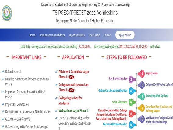 Also Read: ప్రపంచ ర్యాంకింగ్స్లో సత్తా చాటిన ఐఐటీ బాంబే, ఉద్యోగితలో దేశంలోనే టాప్!! తెలంగాణ పీజీఈసెట్ చివరి విడత కౌన్సెలింగ్ షెడ్యూలు ఇలా.. ➥ ఆన్లైన్ రిజిస్ట్రేషన్ కమ్ వెరిఫికేషన్, ఆన్లైన్ ఫీజు చెల్లింపు, సర్టిఫికేట్ల స్కానింగ్: 18.10.2022 - 22.10.2022. ➥ అర్హులైన అభ్యర్థుల జాబితా ప్రకటన: 23.10.2022. ➥ వెబ్ఆప్షన్లు (ఫేజ్-2): 24.10.2022 - 25.10.2022. ➥ వెబ్ఆప్షన్ల ఎడిట్ (ఫేజ్-2): 26.10.2022. ➥ కాలేజీల వారీగా అభ్యర్థుల ప్రాథమిక జాబితా ప్రకటన (ఫేజ్-1): 30.10.2022. ➥ సంబంధిత కళాశాలలో రిపోర్టింగ్, ట్యూషన్ ఫీజు చెల్లింపు: 31.10.2022 - 03.11.2022.