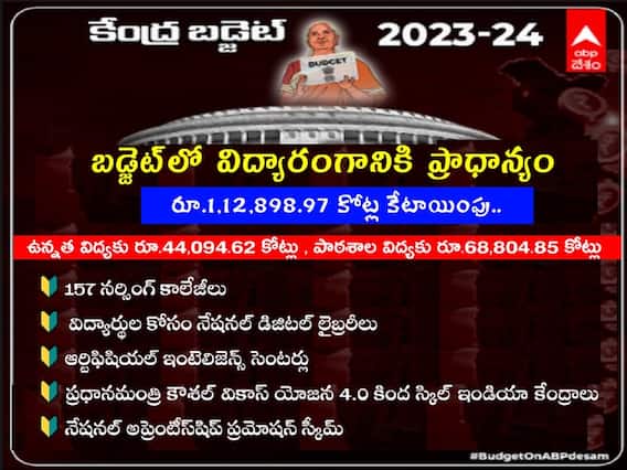 రూ.1,12,898.97 కోట్ల కేటాయింపు..ఈ ఏడాది బడ్జెట్లో విద్యారంగానికి కేటాయింపులు పెరిగాయి. 2023-24 ఆర్థిక సంవత్సరానికిగాను మొత్తం రూ.1,12,898.97 కోట్ల నిధులను కేంద్రం కేటాయించింది. ఇందులో రూ.44,094.62 కోట్లు ఉన్నత విద్యకు, పాఠశాల విద్యకు రూ.68,804.85 కోట్లు కేటాయించింది. గత ఆర్థిక సంవత్సరం కంటే ఈ ఏడాదికి ఉన్నత విద్యకు రూ.₹40828.35 కోట్లు, పాఠశాల విద్యకు రూ.9,752.07 కోట్లు అధికంగా కేటాయింపులు జరిపారు.