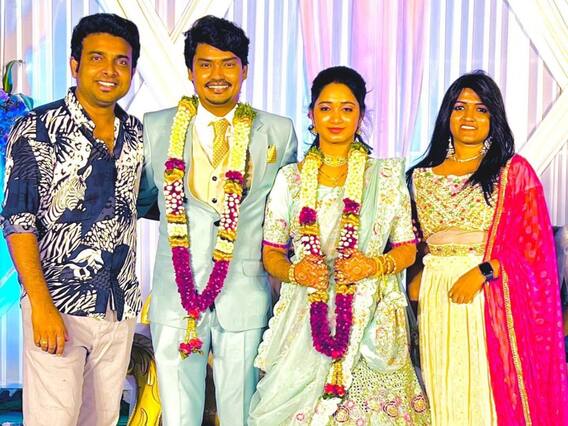 Kevvu Karthik Marriage: ఈ ఏడాది సమ్మర్ లో వివాహ ముహూర్తాలు ఎక్కువగా ఉండటంతో చాలా మంది పెళ్లిపీటలెక్కేస్తున్నారు. సినిమా, టీవీ కు సంబంధించిన సెలబ్రెటీలు కూడా మూడుముళ్ల బంధంతో కొత్త జీవితంలోకి అడుగుపెడుతున్నారు. ఇటీవలే సినిమా హీరో శర్వానంత్-రక్షిత రెడ్డి పెళ్లి జైపూర్ లో ఘనంగా జరిగింది. తాజాగా బుల్లితెర కమెడీయన్ కెవ్వు కార్తీక్ కూడా ఓ ఇంటివాడయ్యాడు. శ్రీలేఖ అనే అమ్మాయిని పెళ్లి చేసుకున్నాడు కార్తీక్. కార్తీక్-శ్రీలేఖ ల పెళ్లి హైదరాబాద్ లో ఘనంగా జరిగింది. ఈ పెళ్లి వేడుకకు టాలీవుడ్ ఇండస్ట్రీ నుంచి పలువురు సెలబ్రెటీలు హాజరై నూతన వధూవరులను ఆశీర్వదించారు. అలాగే బుల్లితెర నుంచి కూడా పులువురు ఆర్టిస్ట్ హాజరై సందడి చేశారు. అందుకు సంబంధించిన ఫోటోలు నెట్టింట వైరల్ అవుతున్నాయి. ఈ ఫోటోలు చూసి నెటిజన్స్ కొత్త జంట కు శుభాకాంక్షలు చెబుతూ కామెంట్లు చేస్తున్నారు.
