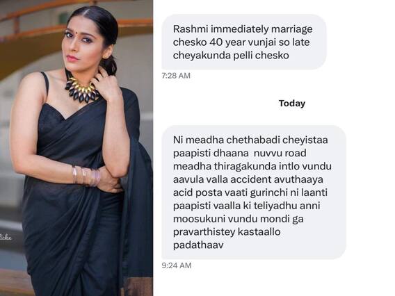 తాజాగా మరో నెటిజన్ ఆమెపై యాసిడ్ పోస్తానంటూ హెచ్చరించాడు. మైక్రోమ్యాక్స్ అనే ఓ అకౌంట్ నుంచి ఆమెకు మెసేజ్ వచ్చింది. ఒకప్పుడు ఇదే వ్యక్తి “రష్మీ ముందుగా వెంటనే నువ్వు పెళ్లి చేసుకో 40 ఏళ్లు దాటుతున్నాయి. అందుకే, లేట్ చేయకుండా పెళ్లి చేసుకో” అంటూ గతేడాది సలహా ఇచ్చాడు. అదే వ్యక్తి తాజాగా తీవ్ర స్థాయిలో వార్నింగ్ ఇచ్చాడు. “నీ మీద చేతబడి చేయిస్తా పాపిష్టి దాన. నువ్వు రోడ్డు మీద తిరగకుండా ఇంట్లో ఉండు. ఆవుల వల్ల యాక్సిడెంట్లు అవుతున్నాయా? ఆసిడ్ పోస్తా. వాటి గురించి నీలాంటి పాపిష్టి వాళ్ళకి తెలియదు. అన్ని మూసుకుని ఉండు. మొండిగా ప్రవర్తిస్తే కష్టాల్లో పడతావు” అంటూ సదరు నెటిజన్ వార్నింగ్ ఇచ్చాడు.