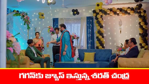 అంటూ అపూర్వ జ్యూస్ తీసుకురావడానికి వెళ్తుంది. చెర్రి, శారదకు ఫోన్ చేసి గగన్.. నక్షత్ర బర్తుడే పార్టీకి వచ్చాడని చెప్తాడు. శారద షాక్ అవుతుంది. వాడు అక్కడికి వచ్చాడా..? ఏమైనా గొడవ అవుతుందా..? అంటూ కంగారు పడుతుంది. ఏం లేదని అంత కూల్గా ఉందని ఒకవేళ గొడవ అయితే నేనే మీకు ఫోన్ చేస్తాను అంటూ ఫోన్ కట్ చేస్తాడు. గగన్, మంత్రి, శరత్చంద్ర కూర్చుని మాట్లాడుతుంటారు. ఇంతలో పనిమనిషి జ్యూస్ తీసుకొచ్చి ఇస్తుంది. శరత్ చంద్ర మినిస్టర్కు ఇస్తాడు. గగన్ జ్యూస్ తీసుకోడు. నా గెస్టు మీరు ఇవ్వలేదని తీసుకోలేదు అంటాడు మినిస్టర్. దీంతో శరత్చంద్ర జ్యూస్ తీసి గగన్కు ఇస్తాడు. తర్వాత పార్టీలో గగన్, భూమి కోసం వెతుకుతుంటాడు. భూమి తప్పించుకుని తిరుగుతుంది. గగన్ కోసం చెర్రి వెతుకుతుంటాడు.