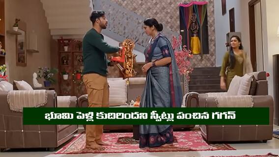 తర్వాత అపూర్వ ప్లాన్ ప్రకారం భూమి కోసం పెళ్లి సంబంధం తీసుకొస్తుంది. ఆ విషయం తెలిసిన భూమి ఇంట్లోంచి వెళ్లిపోతుంది. నేరుగా గగన్ ఇంటికి వెళ్లి శారదను కలిసి ఏడుస్తూ గగన్ బావను తప్పా నేను ఎవరిని పెళ్లి చేసుకోనని చెప్తుంది. ఇంతలో ఇంటికి వచ్చిన గగన్, భూమిని చూసి శరత్చంద్రకు ఫోన్ చేస్తాడు. ఒక అమ్మాయి ఇష్టాఇష్టాలు తెలుసుకోకుండా పెళ్లి చేయాలనుకోవడం మూర్ఖత్వం. ఇప్పుడు నీ కూతురు నా ఇంటి దగ్గర ఉంది అని చెప్తాడు. దీంతో శరత్ చంద్ర షాక్ అవుతాడు. తర్వాత ఇంటికి తిరిగి వచ్చిన భూమిని, శరత్ చంద్ర తాను తీసుకొచ్చిన సంబంధం ఓకే చేయమని నువ్వు ఒప్పుకున్నా ఒప్పుకోకపోయినా పెళ్లి చేస్తానని పెళ్లి వారితో తాంబూలాలు తీసుకుంటాడు. దీంతో భూమి డైలమాలో పడిపోతుంది.