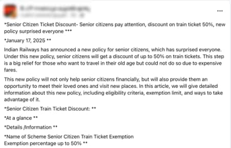 Indian Railways Has Not Restored Senior Citizen Concessions on Train Ticket Fares: సీనియర్ సిటిజన్లకు రైలు టిక్కెట్ ఛార్జీలపై 50% రాయితీని అందించే కొత్త విధానాన్ని భారతీయ రైల్వేలు ప్రకటించాయని పేర్కొంటూ సోషల్ మీడియాలో పోస్టులు (ఇక్కడ, ఇక్కడ & ఇక్కడ) విస్తృతంగా ప్రచారం అవుతున్నాయి.అందులో ఇందులో నిజం ఎంత అనేది మేము పరిశీలన చేశాం.