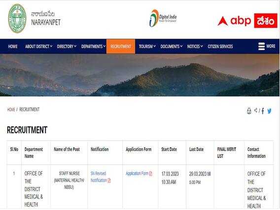 దరఖాస్తు విధానం: ఆఫ్లైన్ దరఖాస్తులను జిల్లా వైద్యారోగ్య అధికారి కార్యాలయం, సింగారం ఎక్స్-రోడ్, నారాయణపేట చిరునామాకు పంపించాలి.