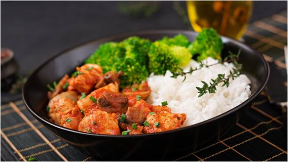 ఇప్పుడు ప్లేట్ తీసుకుని దానిలో కప్పు రైస్.. ఓ పక్క చికెన్, మరో పక్క వెజ్ సలాడ్ పెట్టుకుంటే.. టేస్టీ, హెల్తీ లంచ్ రెడీ. ఈ మొత్తం లంచ్లో కేలరీలు 600 గ్రాములు ఉంటాయి. ప్రోటీన్ 46 గ్రాములు, కార్బ్స్, 66 గ్రాములు, ఫ్యాట్స్ 20 గ్రాములు, ఫైబర్ 8 గ్రాములు ఉంటాయి. టేస్ట్ చాలా బాగుంటుంది. అయితే మీ రైస్ బౌల్ని ఇలా చేసుకున్నప్పుడు ముందుగా వెజ్ తినాలి. తర్వాత ప్రోటీన్, కార్బ్స్ని తీసుకోవాలి. ప్రోపర్గా డైట్ ఫాలో అయ్యేవారు ముందుగా ఫైబర్ తీసుకుని తర్వాత ప్రోటీన్, కార్బ్స్ తీసుకుంటారు. ఈ తరహా డైట్ బరువు తగ్గడంలో హెల్ప్ చేస్తుంది.