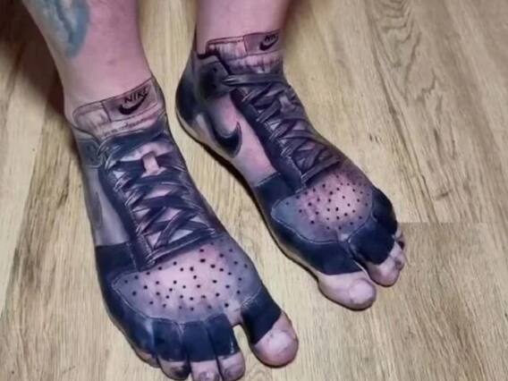 ఇతడికి షూస్ వేసుకోడానికి బద్దకమో, లేదా ఖరీదైన బ్రాండెట్ షూస్ కొనులేకపోతున్నా అనే బాధో, పదే పదే చెప్పులు కొనుగోలు చేయడం ఇష్టం లేదో.. లేదా మరేదైనా అభిరుచో తెలీదుగానీ.. కాళ్లకు ఏకంగా నైక్ (Nike) కంపెనీ షూస్ తరహాలో టాటూ వేయించుకున్నాడు. యునైటెడ్ కింగ్డమ్లోని మాంచెస్టర్కు చెందిన ప్రముఖ టాటూ ఆర్టిస్ట్ డీన్ గున్థర్ తన క్లయింట్ పాదాలపై ఒక జత స్నీకర్లను పచ్చబొట్టు పొడిచాడు.
