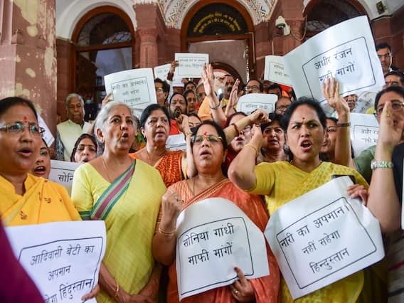 Adhir Ranjan Chowdhury's Remark: పార్లమెంట్ ఉభయసభలు రాష్ట్రపతిపై వివాదస్పద వ్యాఖ్యల వివాదంతో స్తంభించిపోయాయి. కాంగ్రెస్ ఎంపీ అధీర్ రంజన్ చౌధురి రాష్ట్రపతి ద్రౌపది ముర్మును ఉద్దేశించి 'రాష్ట్రపత్ని' అనటం తీవ్ర వివాదస్పదమైంది. ఈ వ్యాఖ్యలపై భాజపా మండిపడింది. కాంగ్రెస్ క్షమాపణలు చెప్పాలంటూ ఉభయసభలు ప్రారంభం కాగానే భాజపా ఎంపీలు ఆందోళనకు దిగారు.