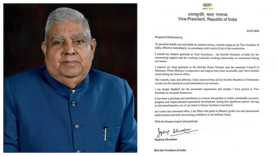 అనారోగ్య కారణాలను పేర్కొంటూ రాజ్యాంగంలోని ఆర్టికల్ 67 (ఎ) కింద జగదీప్ ధన్ఖడ్ రాజీనామా చేస్తున్నట్లు రాష్ట్రపతి ద్రౌపది ముర్ముకు రాసిన లేఖలో ప్రకటించారు. రాష్ట్రపతి ద్రౌపది ముర్ముకు రాసిన లేఖలో ఏమన్నారంటే,"ఆరోగ్యానికి అధిక ప్రాధాన్యత ఇవ్వడానికి, వైద్య సలహాలను అనుసరించడానికి నేను తక్షణమే భారత ఉపరాష్ట్రపతి పదవికి రాజీనామా చేస్తున్నాను. మన గొప్ప ప్రజాస్వామ్యంలో ఉపరాష్ట్రపతిగా నేను పొందిన అమూల్యమైన అనుభవాలకు నేను చాలా కృతజ్ఞుడను. ప్రధానమంత్రి నరేంద్ర మోదీ సహకారం, మద్దతు అమూల్యమైనది. నా పదవీకాలంలో ఆయన నుంచి నేను చాలా నేర్చుకున్నాను."