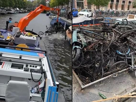 నదులు, సముద్రాలను ఎంత కలుషితం చేయాలో అంత కలుషితం చేస్తున్నాం. ఇప్పటికే ఆ నీళ్లలో టన్నుల కొద్ది ప్లాస్టిక్ వ్యర్థాలు బయట పడుతున్నాయి. క్లీన్ చేసిన ప్రతిసారీ కుప్పలుకుప్పలుగా ప్లాస్టిక్ కవర్లు పోగవుతున్నాయి. ఇవే కాదు. మరెన్నో వ్యర్థాలు ఈ నీళ్లలో కలిసి పోతున్నాయి. ప్రపంచవ్యాప్తంగా అన్ని చోట్లా ఇదే దుస్థితి. దీనికి ఉదాహరణగా...ఓ వీడియో ఇప్పుడు సోషల్ మీడియాలో వైరల్అవుతోంది. యాంస్టర్డామ్లో ఓ కెనాల్ను శుభ్రం చేయాలని వెళ్లిన సిబ్బందికి ఊహించని షాక్ తగిలింది. క్రెయిన్తో లోపలి వ్యర్థాలను బయటకు తీద్దామని ప్రయత్నిస్తుంటే...ఒకటి తరవాత ఒకటి పాత బైక్లు బయటకు వచ్చాయి. అలా పదుల సంఖ్యలో బయట పడుతూనే ఉన్నాయి. 16 సెకన్ల నిడివి ఉన్న ఈ వీడియోలో ఈ బైక్లను నీళ్లలో నుంచి బయటకు తీస్తుండటాన్ని చూడొచ్చు. ఈ నెల 8వ తేదీన ఈ వీడియోని ట్విటర్లో పోస్ట్ చేశారు. ఇప్పటికే 80 లక్షల వ్యూస్...వందలాది కామెంట్స్ వచ్చాయి. ఈ వీడియో చూసి అందరూ ఆశ్చర్యపోతున్నారు. అన్ని బైక్లను నీళ్లలో పారేశారా అని ముక్కుమీద వేలు వేసుకుంటున్నారు.