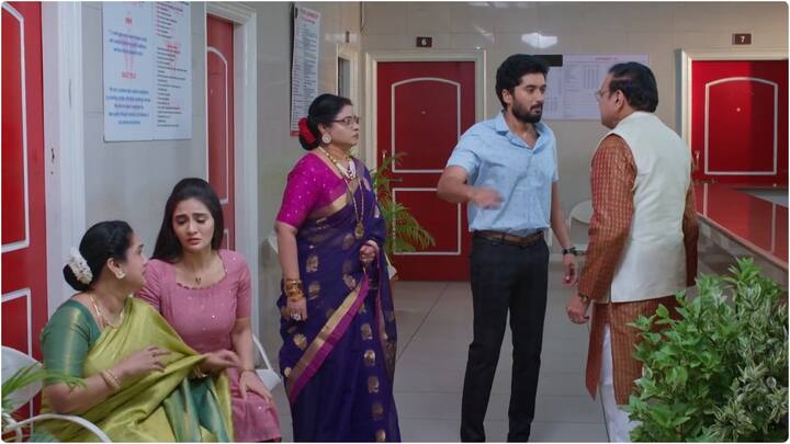 కార్తీక్ దశరథ్ని చూసేందుకు ఆస్పత్రికి వెళ్తాడు. కానీ దశరథ్, సుమిత్ర కార్తీక్ని అడ్డుకుంటారు. దశరథ్ బతికున్నాడో లేదో చూడడానికి వచ్చావా అంటూ ఆపేస్తారు. (Image Credit: jio+ Hotstar)