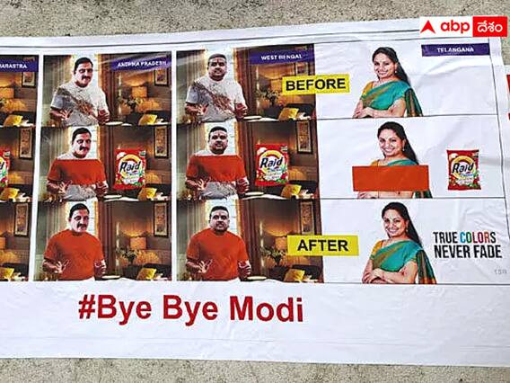 కవిత ఫొటో కూడా పోస్టర్లో వేశారు. తెలంగాణ నుంచి కవిత రైడ్ జరగక ముందు జరిగిన తర్వాత కూడా ఎలాంటి మార్పు లేకుండా ఉన్నారని ఎలాంటి మార్పులు లేవని పేర్కొన్నారు. ట్రూ కలర్ నెవర్ ఫేడ్ అంటూ క్యాప్షన్ కూడా ఇచ్చారు. నిజమైన రంగు ఎప్పటికీ వెలిసిపోదని చెప్పారు. చివరకు బైబై మోడీ అంటూ హ్యాగ్ ట్యాగ్ జత చేశారు.