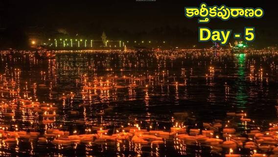 కార్తీకపురాణం ఐదవ అధ్యాయం జనకమహారాజా! శ్రద్ధగా విను... మనం చేసిన పాపాలన్నిటినీ నశింపచేయగల శక్తి కార్తీకమాస వ్రతానికి మాత్రమే ఉంది. కార్తీకమాసంలో విష్ణు సన్నిధిలో ఎవరైతే భగవద్గీత పారాయణ చేస్తారో.. వారి పాపాలన్నీ పాము కుబుసంలా తొలగిపోతాయి. వైకుంఠానికి క్షేత్ర పాలకులుగా మారిపోతారు. ఎవరైతే కార్తీకమాసంలో తులసీదళాలతో కానీ తెలుపు లేదా నలుపు గన్నేరు పూలతో గానీ విష్ణు పూజను చేస్తారో వాళ్ళు వైకుంఠానికి చేరి విష్ణు సమభోగాలు అనుభవిస్తారు. ఈ నెలలో హరిహరుల సన్నిధిలో పురాణ ప్రవచనం చెప్పేవారు కర్మబంధ విముక్తులవుతారు కార్తీక వనభోజనాలు