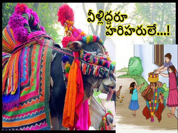 సంక్రాంతిఅయ్యగారికి దణ్ణం పెట్టు..అమ్మగారికి దణ్ణం పెట్టూ అంటూ ఇంటింటికి వచ్చే గంగిరెద్దులు పల్లెకి మరో కళ. శివ లింగాకృతికిని గుర్తుచేసే ఎత్తైన మూపురంతో శివునిడో కలసి సంక్రాంతి సంబరాలకు వచ్చానని చెప్పే సంకేతం బసవన్న. ఇంటి ముందు ముగ్గులో బసవన్న నిల్చుంటే ఆనేల ధర్మభద్దమైనది అని చెబుతారు. ఇక పిల్లల్లో సరదాని రెట్టింపు చేసే హరిదాసుల సందడే వేరు. తలపై పాత్ర పెట్టుకుని భక్తుల కోసం నేరుగా శ్రీహరే హరిదాసుగా మారి వస్తాడని నమ్మకం. తలమీద గుమ్మడికాయ ఆకారంలో ఉండే పాత్ర భూమికి సంకేతం. ఆ పాత్రను తలమీద పెట్టుకోవడం అంటే....శ్రీ హరి అయిన తానే భూమిని ఉద్దరిస్తున్నానని చెప్పటం. భక్తులంతా సమానమంటూ తరతమ భేదాల్లేకుండా ఇంటిఇంటికీ తిరుగుతాడు.