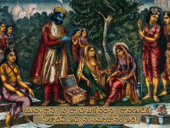 The Conversation of Ravana and Sita : సీతాదేవిని ఎత్తుకెళ్లిన రావణుడు లంకలో అశోక వనంలో ఉంచుతాడు. సీతాదేవిపై అత్యంత వ్యామోహం పెంచుకున్న రావణుడికి ఓ తెల్లవారుజామున ఠక్కున మెలుకువ వచ్చింది. చెప్పలేనంత కామం కలిగింది. అప్పటికప్పుడే పాన్పుపైనుంచి లేచి సీత దగ్గరకు బయలుదేరాడు. ఆ రాత్రి రావణుడితో క్రీడించిన స్త్రీలంతా కూడా లంకాధిపతిని అనుసరించారు. ఆ స్త్రీలలో ఒకరు బంగారుపాత్రలో మద్యం తీసుకెళ్లింది..మరో స్త్రీ ఆయన ఉమ్మివేసే పాత్ర పట్టుకుంది. ఇంకొకరు గొడుగు పట్టారు, మరికొందరు మంగళవాయిద్యాలు వాయిస్తూ, కత్తులు పట్టుకుని ..ఇలా ఒక్కొక్కరు సపర్యలు చేస్తూ రావణుడి వెంట సాగారు. కానీ ఇవేమీ రావణుడికి పట్టడం లేదు.. కళ్లముందు సీతాదేవి రూపం, ఆమెను వశపర్చుకోవాలనే విపరీతమైన వాంఛ మాత్రమే ఉంది. ఇంతమంది పరివారంతో ఓ స్త్రీపట్ల తన కామాన్ని వ్యక్తం చేయడానికి బయలుదేరాడు రావణుడు.