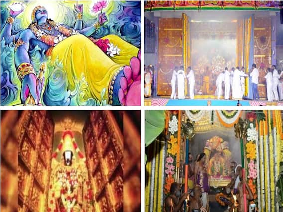 Also Read: 11 ఇంద్రియాలపై నియంత్రణే వైకుంఠ ఏకాదశి దీక్షలో ఆంతర్యంముక్కోటి ఏకాదశి రోజున ఎక్కువ మంది భక్తులు ఉత్తర ద్వారం గుండా శ్రీమన్నారాయణుని దర్శించుకోవాలని ఆరాటపడుతుంటారు. శ్రీ మహావిష్ణువు కొలువై ఉన్న వైకుంఠంలోని వాకిళ్లు ఈరోజునే తెరుచుకుంటాయని చెబుతారు. వైకుంఠం వాకిళ్లు తెరుచుకునే పర్వదినం రోజున శ్రీమహావిష్ణువు గరుడ వాహనంపై మూడు కోట్ల దేవతలతో భూలోకానికి వచ్చి భక్తులకు దర్శనమిస్తాడు. రాక్షసుల బాధలు భరించలేక దేవతలంతా ఉత్తర ద్వారం దాటి శ్రీమన్నారాయణుడిని దర్శించుకుని తమ బాధలు విన్నవించుకున్నారు. అనుగ్రహించిన శ్రీ మహావిష్ణువు ఆ పీడ వదిలించాడని.. అందుకే ఉత్తర ద్వార దర్శనం చేసుకుంటే మనల్ని పట్టిపీడిస్తున్న ఎన్నో సమస్యలు తీరిపోతాయని భక్తుల విశ్వాసం.