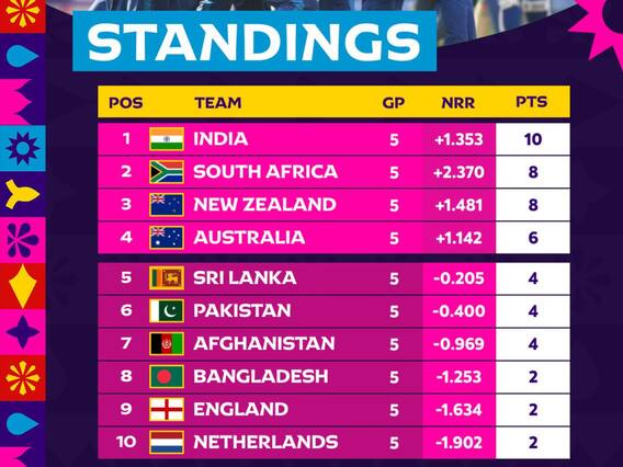 స్వదేశంలో అప్రతిహాత విజయాలతో దూసుకుపోతున్న భారత జట్టు పాయింట్ల పట్టికలో అగ్రస్థానంలో కొనసాగుతోంది. ఈ ప్రపంచకప్లో ఇప్పటివరకూ అయిదు మ్యాచ్లు ఆడిన రోహిత్ సేన అన్నింట్లో విజయం సాధించి పది పాయింట్లో పాయింట్ల పట్టికలో తొలి స్థానంలో ఉంది. ప్రత్యర్థి బౌలర్లను ఊచకోత కోస్తూ భారీ స్కోర్లు నమోదు చేస్తున్న దక్షిణాఫ్రికా 8 పాయింట్లతో రెండో స్థానంలో ఉంది. నెదర్లాండ్స్పై ఒక్క ఓటమి మినహా, టోర్నమెంట్ అంతటా ప్రోటీస్ పూర్తి ఆధిపత్యాన్ని ప్రదర్శించింది. న్యూజిలాండ్ 8 పాయింట్లతో మూడో స్థానంలో ఉంది. భారత్తో జరిగిన మ్యాచ్లో ఓడిపోయిన కివీస్.. మిగిలిన అన్ని మ్యాచుల్లో విజయం సాధించి మూడో స్థానంలో కొనసాగుతోంది. మహా సంగ్రామంలో తొలి రెండు మ్యాచుల్లో పరాజయం పాలైన కంగారులు.... తర్వాత పుంజుకుని పాయింట్ల పట్టికలో నాలుగో స్థానానికి చేరుకున్నారు. తర్వాత మూడు మ్యాచుల్లో గెలిచిన కంగారులు 6 పాయింట్లతో నాలుగో స్థానంలో ఉన్నారు. ఈ నాలుగు జట్లే సెమీస్ చేరుతాయాని మాజీ క్రికెటర్లు విశ్లేషిస్తున్నారు. నాలుగు పాయింట్లతో పాకిస్థాన్ అయిదో స్థానంలో అవే నాలుగు పాయింట్లతో అఫ్గానిస్థాన్ అరవ స్థానంలో ఉంది. శ్రీలంక, ఇంగ్లండ్, బంగ్లాదేశ్, నెదర్లాండ్స్ 2 పాయింట్లతో పాయింట్ల పట్టికలో అట్టడుగున ఉన్నాయి.