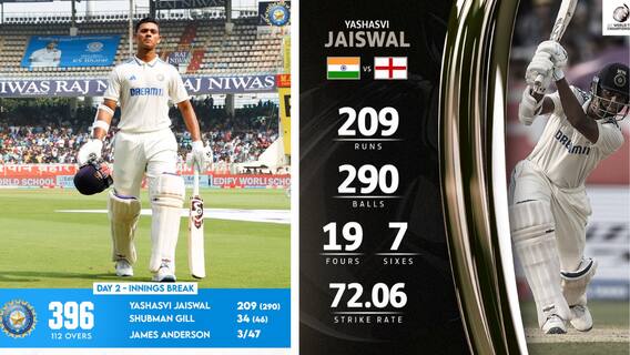 వైజాగ్ వేదికగా జరుగుతున్న రెండో టెస్ట్లో యశస్వి జైస్వాల్ అద్భుత ఆటతీరుతో అపద్భాందువుడి పాత్ర పోషిస్తున్నాడు. అవతలి బ్యాటర్లు అర్థ శతకం చేసేందుకే కష్టాలు పడుతున్న వేళ... అజేయ ద్వి శతకంతో టీమిండియాను భారీ స్కోరు దిశగా తీసుకెళ్తున్నాడు. యశస్వి జైస్వాల్ ద్వి శతకంతో టీమిండియా ప్రస్తుతం 7 వికెట్ల నష్టానికి 383 పరుగులు చేసింది. యశస్వి జైస్వాల్ ఒంటరి పోరాటం చేస్తున్నాడు. 290 బంతులు ఎదుర్కొన్న జైస్వాల్...19 ఫోర్లు, 7 సిక్సులతో 209 పరుగులు చేసి అవుటయ్యాడు. జైస్వాల్కు తోడుగా కుల్దీప్ క్రీజులో ఉన్నాడు. యశస్వి మినహా మరే భారత బ్యాటర్ పెద్దగా రాణించలేదు. మిగిలిన భారత బ్యాటర్లలో ఏ ఒక్కరూ కనీసం అర్ధ శతకం కూడా సాధించలేక పోయారు. ఈ మ్యాచ్లో సిక్సర్తో సెంచరీ మార్క్ అందుకున్న జైస్వాల్ అరుదైన రికార్డును తన పేరిట లిఖించుకున్నాడు. ఇంగ్లాండ్ బౌలర్లలో అండర్సన్ మూడు, బషీర్ మూడు, అహ్మద్ మూడు వికెట్లు తీశారు.