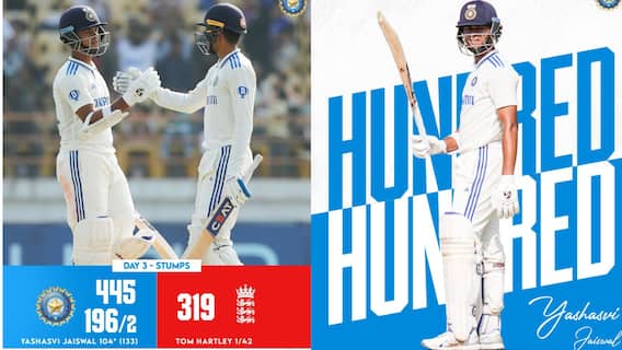 India vs England 3rd Test Day 3 India lead by 322 runs vs England: రాజ్కోట్ వేదికగా జరుగుతున్న మూడో టెస్ట్లో భారత్(Bharat) పట్టు బిగించింది. రెండో రోజు ఆటలో ఇంగ్లాండ్ (England)ఆధిపత్యం ప్రదర్శించగా... మూడోరోజు టీమిండియా(Team India) సంపూర్ణ ఆధిపత్యం ప్రదర్శించింది. మూడో రోజు తొలి ఇన్నింగ్స్లో బ్రిటీష్ జట్టును త్వరగానే అవుట్ చేసిన భారత జట్టు... అనంతరం రెండో ఇన్నింగ్స్లో మెరుగ్గా బ్యాటింగ్ చేసి టెస్ట్ మ్యాచ్పై పట్టు బిగించింది. మూడో రోజు ఆట ముగిసే సమయానికి టీమిండియా రెండు వికెట్ల నష్టానికి 196 పరుగులు చేసింది. ప్రస్తుతం 322 పరుగుల ఆధిక్యంలో ఉన్న భారత్ చేతిలో ఇంకా ఎనిమిది వికెట్లు ఉన్నాయి. యశస్వి జైస్వాల్ మరోసారి శతక గర్జన చేశాడు. ఇంకో రెండు రోజులు ఆట మిగిలి ఉన్న వేళ... భారత్కే విజయావకాశాలు ఎక్కువగా ఉన్నాయి.