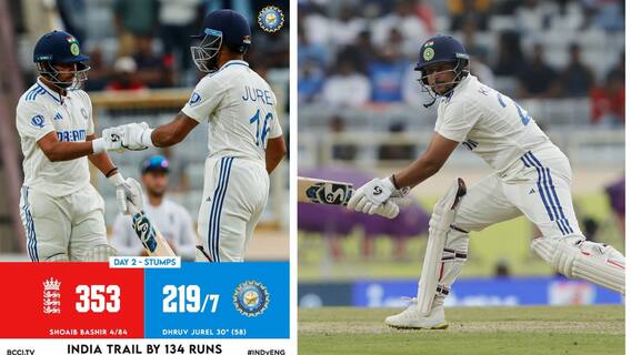 అనంతరం తొలి ఇన్నింగ్స్ ప్రారంభించిన భారత్కు...ఆదిలోనే షాక్ తగిలింది. 4 పరుగుల వద్ద రోహిత్ పెవిలియన్ చేరాడు. జైస్వాల్ 73 పరుగులతో రాణించగా.. గిల్ 38, రజత్ పాటిదార్ 17, రవీంద్ర జడేజా 12, సర్ఫరాజ్ ఖాన్ 14, అశ్విన్ ఒక పరుగు చేసి పెవిలియన్కు చేరారు. దీంతో 177 పరుగులకే భారత్ ఏడు వికెట్లు కోల్పోయింది. టీమిండియా 200లోపే ఆలౌట్ అవుతుందని అంతా భావించినా కుల్దీప్ యాదవ్, ధ్రువ్ జురెల్ నిలబడ్డారు. వీరిద్దరూ 42 పరుగుల భాగస్వామ్యం నెలకొల్పడంతో భారత్ మరో వికెట్ పడకుండా 219 పరుగులు చేయగలిగింది. ప్రస్తుతం.. ఇంగ్లండ్ కంటే భారత్ ఇంకా 134 పరుగుల వెనుకంజలో ఉంది..