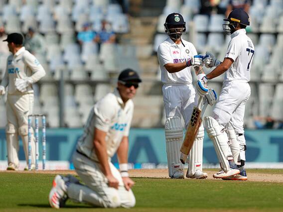ముంబయి టెస్టులో న్యూజిలాండ్కు ఇక కష్టమే! ఆ జట్టుకు టీమ్ఇండియా 540 పరుగుల భారీ లక్ష్యం నిర్దేశించింది. 276/7 వద్ద కోహ్లీసేన రెండో ఇన్నింగ్స్ను డిక్లేర్ చేసింది. మయాంక్ అగర్వాల్ (62; 108 బంతుల్లో 9x4, 1x6) అర్ధశతకంతో అదరగొట్టాడు. చెతేశ్వర్ పుజారా (47; 97 బంతుల్లో 6x4, 1x6), శుభ్మన్ గిల్ (47; 75 బంతుల్లో 4x4, 1x6) త్రుటిలో అర్ధశతకం చేజార్చుకున్నారు. అక్షర్ పటేల్ (41*; 26 బంతుల్లో 3x4, 4x6) అజేయంగా నిలిచాడు. మొత్తంగా కివీస్ స్పిన్నర్ అజాజ్ పటేల్ ఈ మ్యాచులో 14 వికెట్లు తీశాడు.