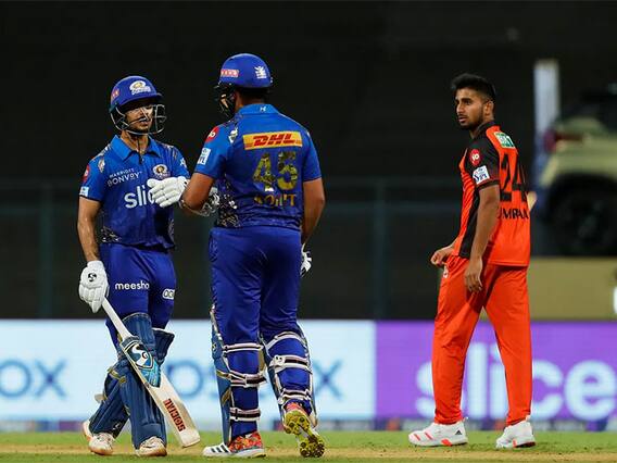 భారీ లక్ష్య ఛేదనకు దిగిన ముంబయి ఇండియన్స్కు సూపర్బ్ స్టార్ట్ దక్కింది. ఓపెనర్లు రోహిత్ శర్మ (48; 36 బంతుల్లో 2x4, 4x6), ఇషాన్ కిషన్ (43; 34 బంతుల్లో 5x4, 1x6) చక్కగా ఆడారు. తొలి వికెట్కు 66 బంతుల్లోనే 95 పరుగుల విలువైన భాగస్వామ్యం అందించారు. తొలి రెండు ఓవర్లు స్లోగా ఆడిన ఈ జోడీ లయ అందుకోగానే చెలరేగింది. నువ్వా నేనా అన్నట్టుగా ఇద్దరూ ఆడారు. దాంతో 6 ఓవర్లకే స్కోరు 51కి చేరుకుంది. ఇదే జోరు కొనసాగిస్తున్న కీలక సమయంలో అర్ధశతకానికి చేరువైన హిట్మ్యాన్ను జట్టు స్కోరు 95 వద్ద వాషింగ్టన్ సుందర్ ఔట్ చేశాడు. మరికాసేపటికే ఓ ఫాస్టెస్ట్ డెలివరీతో ఇషాన్ కిషన్ను ఇమ్రాన్ మాలిక్ పెవిలియన్ పంపించాడు. డేనియెల్ సామ్స్ (15), తిలక్ వర్మ (8) అతడే ఔట్ చేశాడు. కష్టాల్లో పడ్డ ముంబయిని టిమ్ డేవిడ్ ఆదుకున్నాడు. నటరాజన్ వేసిన 18వ ఓవర్లో ఏకంగా 26 పరుగులు సాధించాడు. అయితే ఆఖరి బంతికి అనవసర సింగిల్కు ప్రయత్నించి అతడు రనౌట్ అయ్యాడు. 12 బంతుల్లో 18 పరుగులు అవసరమైన సమయంలో 19వ ఓవర్ను భువీ వికెట్ మెయిడిన్గా మలిచాడు. ఆ తర్వాతి ఓవర్లో రమన్దీప్ (14) బౌండరీ, సిక్స్ బాదినా 15 పరుగులే రావడంతో ఓటమి పాలైంది.