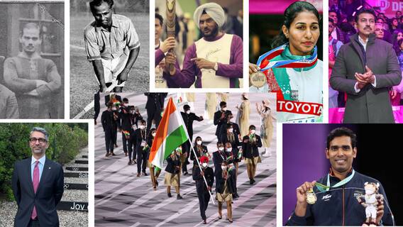 భారత పతాకధారులు ( Image Source : Twitter/@SpoSutra, / olympics.com/@MangteC/@Media_SAI/ @Abhinav_Bindra)