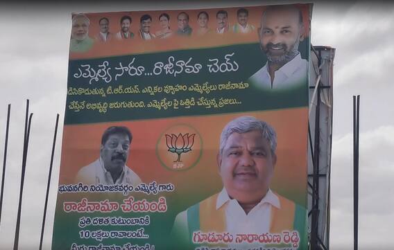 సోషల్ మీడియా ప్రచారంతో పాటు భువనగిరి నియోజకవర్గానికి చెందిన బీజేపీ నాయకుడు గూడూరు నారాయణ రెడ్డి ఒక అడుగుగు ముందు వేశారు. ఇందుకోసం ఆయన కేవలం సోషల్ మీడియాతో మాత్రమే ఆగిపోలేదు. ఏకంగా ఆయన భువనగిరి నియోజకవర్గంలో భారీ ఫ్లెక్సీలను రూపొందించి పట్టణంలోని ప్రధాన ప్రాంతాల్లో ఏర్పాటు చేశారు. ‘‘ఎమ్మెల్యే సారూ.. రాజీనామా చెయ్..’’ అంటూ భారీ అక్షరాలతో ఏర్పాటు చేసిన ఫ్లెక్సీ భువనగిరిలో హాట్ టాపిక్గా మారింది. ‘‘బెడిసికొడుతున్న టీఆర్ఎస్ ఎన్నికల వ్యూహం. ఎమ్మెల్యేలు రాజీనామా చేస్తేనే అభివృద్ధి జరుగుతుంది. ఎమ్మెల్యేలపై ఒత్తిడి చేస్తున్న ప్రజలు. భువనగిరి ఎమ్మెల్యే గారూ.. రాజీనామా చేయండి. ప్రతి దళిత కుటుంబానికి రూ.10 లక్షలు రావాలంటే మీరు రాజీనామా చేయాల్సిందే’’ అంటూ ఫ్లెక్సీలో ముద్రించారు.