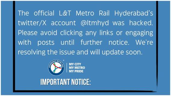 హ్యాక్ అయిన ఎక్స్ను రికవరీ చేసే పనిలో ఉన్నామని పేర్కొంది హైదరాబాద్ మెట్రో. అప్పటి వరకు దాన్ని పట్టించుకోవద్దని తెలిపింది. దీనిపై తమ సిబ్బంది వర్క్ చేస్తున్నారని వివరించింది. పూర్తిగా సెట్ అయిన తర్వాత అందరికీ మరోసారి సమాచారం అందిస్తామని అంది. అప్పటి వరకు అందులో వచ్చే పోస్టుల పట్ల జాగ్రత్త వహించాలని ప్రయాణికులకు సూచించింది.