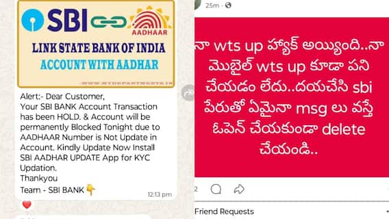 వాట్సాప్ అకౌంట్లు హ్యాక్ చేసిన సైబర్ నేరగాళ్లు మీ స్టేట్ బ్యాంక్ అకౌంట్ కు ఆధార్ నెంబర్ అప్డేట్ చేయలేదనో, ఈ కేవైసీ చేయలేదని.. మీ బ్యాంక్ అకౌంట్ ఈరోజు రాత్రి నుంచి పర్మినెంట్ గా బ్లాక్ అవుతుందని ప్రజలను భయపెడుతున్నారు. ఏపీకే ఫైల్ సెండ్ చేసి నెటిజన్లను ఆందోళనకు గురిచేస్తున్నారు. అయితే ఎవరూ ఇలాంటి మెస్సేజ్ లలో వచ్చిన లింక్స్, ఏపీకే ఫైల్స్ ఓపెన్ చేయవద్దని, డౌన్ లోడ్ చేయవద్దని అధికారులు, పోలీసులు ప్రజలకు సూచించారు.
