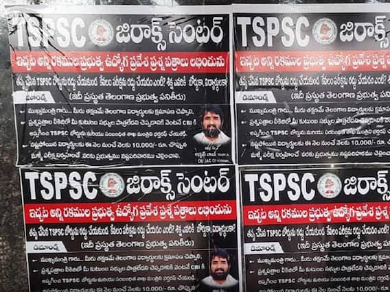 తెలంగాణ పబ్లిక్ సర్వీస్ కమిషన్కు (టీఎస్పీఎస్సీ) చెందిన పరీక్షా పేపర్ల లీకేజీ వ్యవహారంలో మరింత వేడి రాజుకుంటోంది. విపక్షాలకు చెందిన కొంత మంది కమిషన్ పని తీరును ఎండగడుతున్నారు. ఏకంగా గోడలకు పోస్టర్లు అంటించి మరీ నిరసన తెలియజేస్తున్నారు. తాజాగా హైదరాబాద్ లోని టీఎస్పీఎస్సీ ఆఫీసు వద్ద వివాదాస్పద రీతిలో గోడకు అంటించిన వాల్ పోస్టర్లు వాల్ పోస్టర్లు కలకలం రేపాయి. టీఎస్పీఎస్సీ జిరాక్స్ సెంటర్ అని ఎద్దేవా చేస్తూ ఆ పోస్టర్లలో ఉంది. నాంపల్లిలో టీఎస్పీఎస్సీ కార్యాలయం సమీపంలోనే కొంత మంది ‘టీఎస్పీఎస్సీ జిరాక్స్ సెంటర్’ అని ఫ్లెక్సీలు, పోస్టర్లు ఏర్పాటు చేశారు.