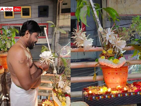 Brahma kamalam News In Telugu: మేడ్చల్ జిల్లా జీడిమెట్ల : షాపూర్ నగర్ ప్రాంతంలో నివాసముండే సురేష్ గౌడ్ ఇంట్లో మూడు సంవత్సరాల కిందట బ్రహ్మ కమలం (Brahma kamalam) ఆకును ఏర్పాటు చేశాడు. డిసెంబర్ నెలలో మొదటిసారి ఒక బ్రహ్మ కమలం పువ్వు కార్తీక పౌర్ణమి రోజున వికసించింది. రెండవసారి ఐదు బ్రహ్మ కమలం పువ్వులు ముక్కోటి ఏకాదశి రోజున వికసించాయి. ఇలా ప్రత్యేకమైన రోజు బ్రహ్మ కమలం పూయడం అనేది సాక్షాత్ ఆ బ్రహ్మ స్వరూపం మా ఇంటికి వచ్చినట్టుగా మేము భావిస్తున్నామని వారు తెలిపారు.