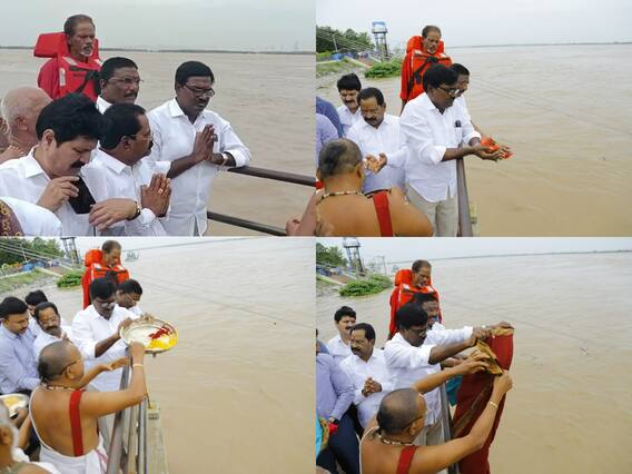 Godavari Floods: భద్రాద్రి కొత్తగూడెం జిల్లాలోని భద్రాచలం గోదావరి నది వద్ద వరద ఉధృతిని తెలంగాణ రవాణా శాఖ మంత్రి పువ్వాడ అజయ్ కుమార్ పరిశీలించారు. ఎగువ నుండి గోదావరికి భారీగా వరద నీరు రావడంతో గోదావరి ఉదృతంగా ప్రవహిస్తుందని, రాగల 24గంటల్లో ప్రవాహం తగ్గి నిలకడగా మారుతుందని అన్నారు. ఈ సందర్భంగా మంత్రి పువ్వాడ అజయ్ కుమార్ గోదావరికి ప్రత్యేక పూజలు చేసి, నది హారతినీ ఇచ్చారు. CCLA డైరెక్టర్ రజత్ కుమార్ షైనీ, సింగరేణి CMD శ్రీధర్, జిల్లా కలెక్టర్ అనుదీప్, ఎస్పి వినీత్ తదితరులు ఉన్నారు.