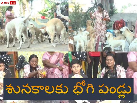 Special Sankranthi Treats For Stray Dogs in Mahabubabad: సంక్రాంతి అంటే మనకు గుర్తొచ్చేది.. భోగి మంటలు, పిల్లలకు భోగి పండ్లు, పిండి వంటలు, గాలి పటాలు, పల్లెల్లో జోరుగా కోడి పందేలు. పిల్లలు ఆయురారోగ్యాలతో ఉండాలని భోగి రోజున వారికి భోగి పండ్లు పోస్తారు. అలా చేస్తే చెడు దృష్టి తొలగిపోయి ఆరోగ్యంగా ఉంటారనేది అందరి నమ్మకం. అయితే, విచిత్రంగా ఓ కుటుంబం వీధి కుక్కలకు భోగి పండ్లు పోసింది. పిల్లలు మాదిరిగానే వాటికి వేడుక నిర్వహించి తమ జంతు ప్రేమను చాటుకుంది. ఈ ఒక్కసారే కాదు గత 12 ఏళ్లుగా ప్రతీ సంక్రాంతికి శునకాలకు భోగి పండ్లు పోసి వాటిపై మమకారాన్ని చాటుకుంటున్నారు.
